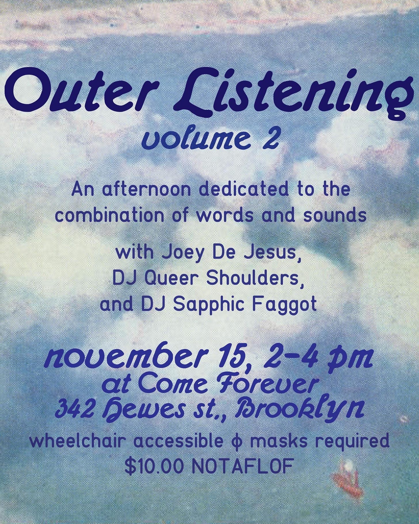 Next Saturday at Come Forever in Williamsburg, you are warmly invited to the second volume of Outer Listening, a mask-required lounge space at the intersection of words and sound. We’re thrilled to welcome Joey de Jesus and their band Materia. I’ll be playing the opening set before the band, and Mars / DJ Sapphic Faggot will close us out! Tickets are here (and at the door, with no one turned away).