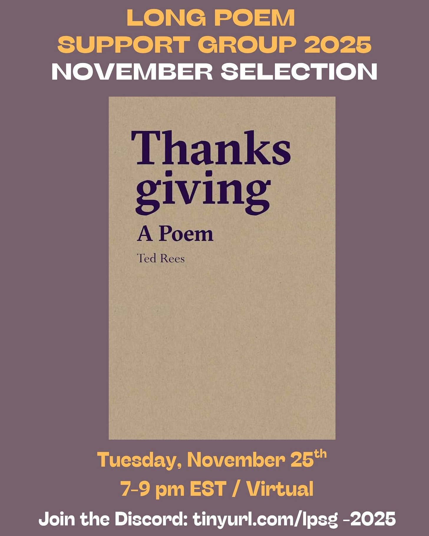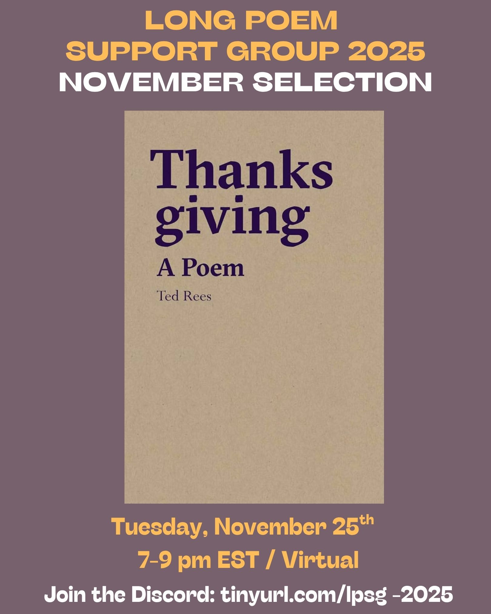 This month’s Long Poem Support Group pick is one of my favorite poems, Thanksgiving by Ted Rees. Join us on Tuesday the 25th on Discord!
